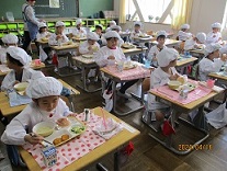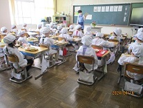 初めての給食着・帽子をつけてみんなで準備、配膳をしました。