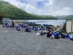 赤城山に到着しましたが、あいにくの雨模様。1日目は地蔵岳登山の予定でしたが、天候と登山道の状況を勘案し、子供たちの安全を第一と考え、登山は中止、代わりに大沼散策をし、お土産も購入しました。その後、山の家に戻り、室内レクを行いましたが、これが大盛り上がりです。